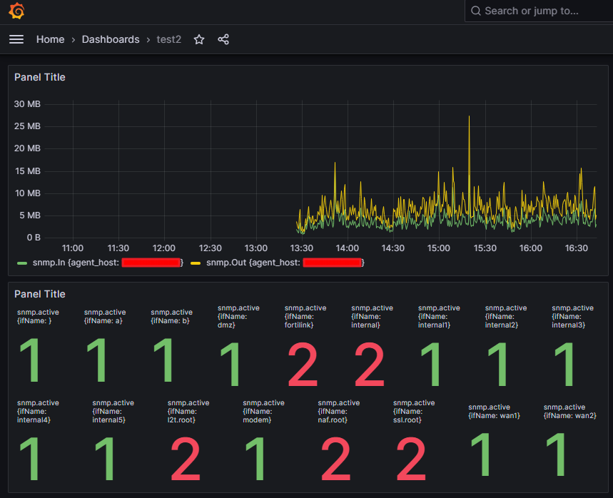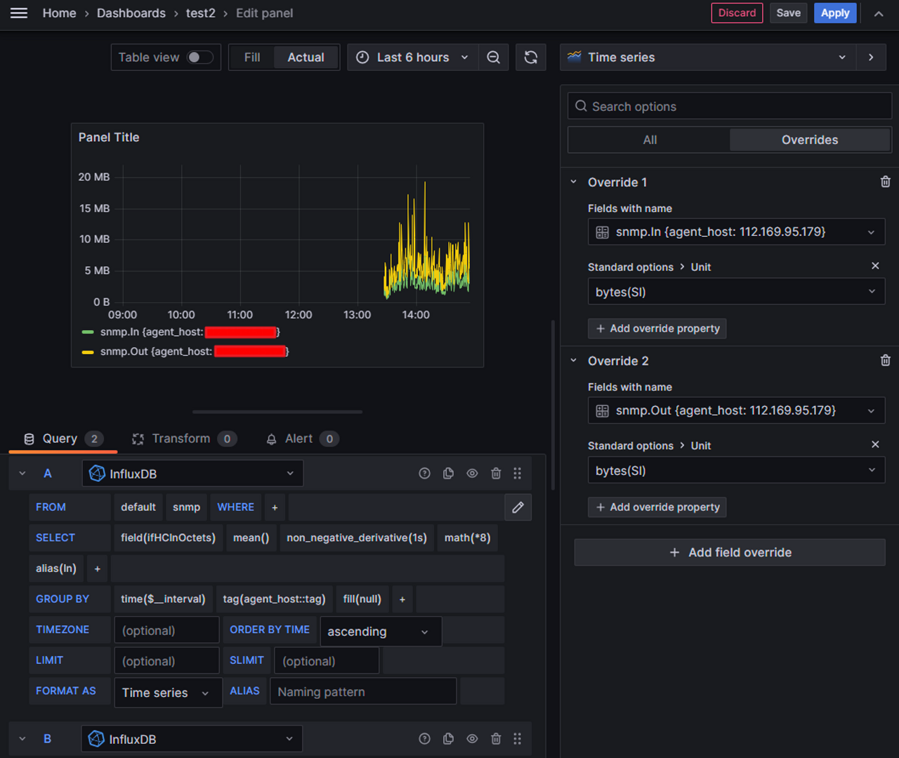 SELECT non_negative_derivative(mean("ifHCInOctets"), 1s) *8 AS "In" FROM "snmp" WHERE $timeFilter GROUP BY time($__interval), "agent_host"::tag fill(null)