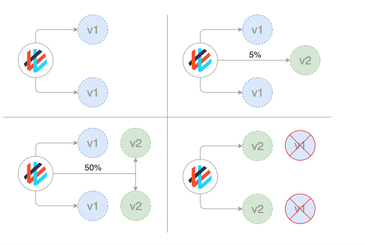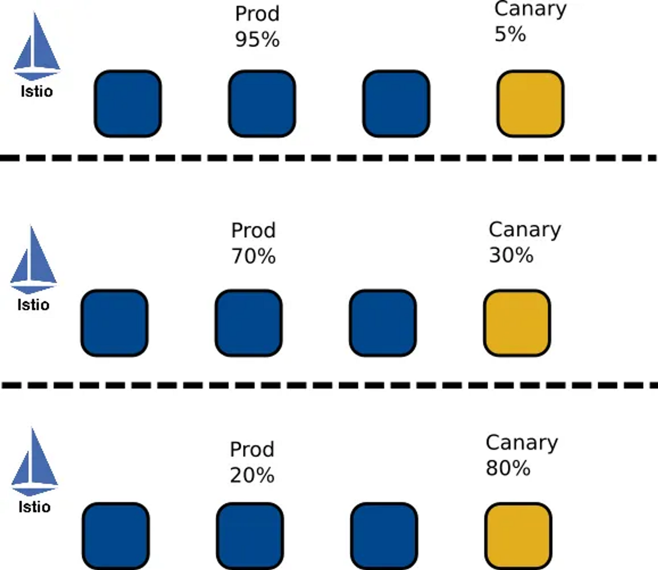 Canary 배포는 새 버전이 모든 사용자에게 릴리스되기 전에 초기 테스트로 일부 사용자에게 점진적으로 롤아웃하는 방법이다. 이 방법의 목적은 성능 메트릭을 수집하고 전체 배포에 대한 사용자의 영향을 예측하기 위해 소수의 사용자를 대상으로 하는 것입니다. 또한 Istio 등을 사용하면 특정 조건 ( 예를 들어, IE 사용자는 신규앱, 나머지는 기존앱, 특정 IP는 신규앱, 나머지는 기존앱 )으로도 사용자 요청을 분배해서 처리할 수 있다.