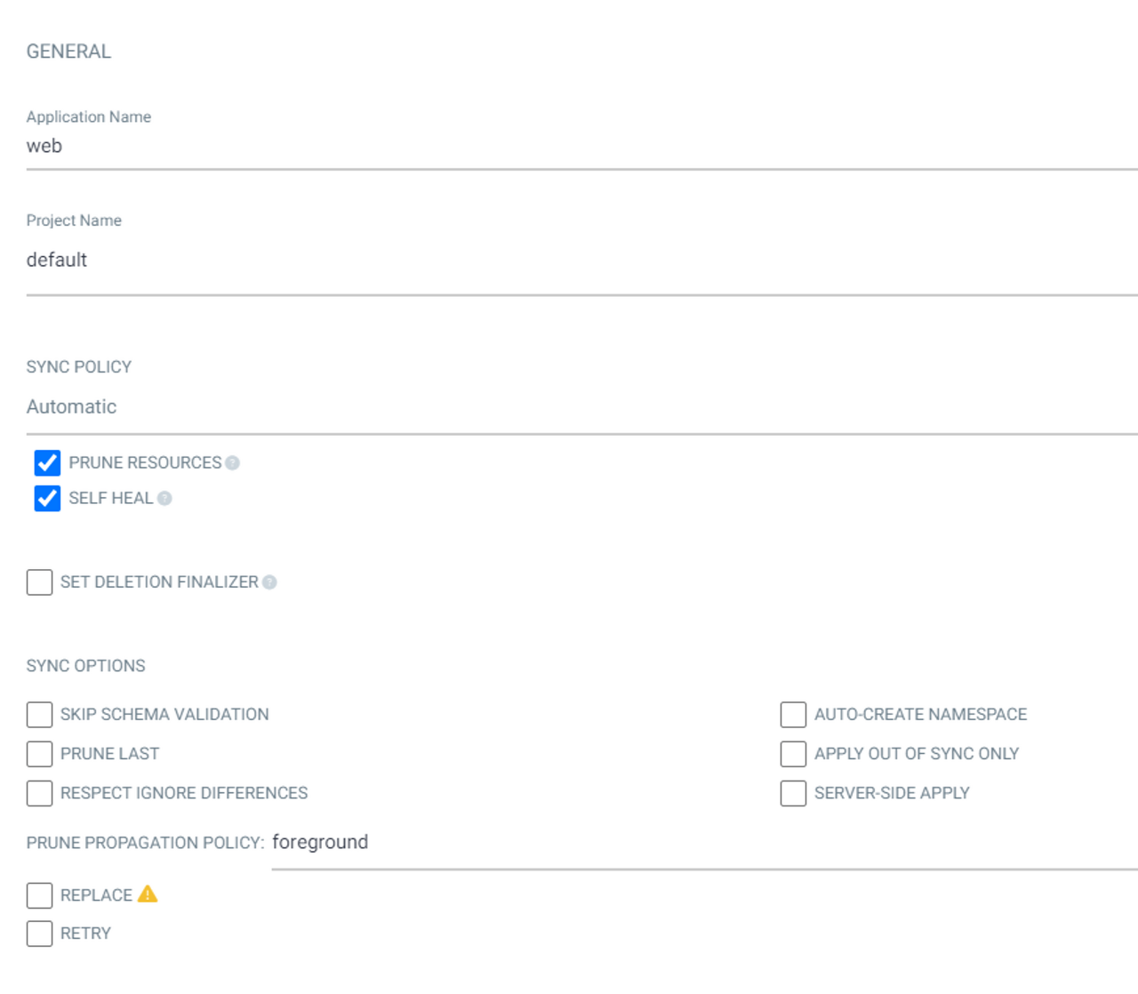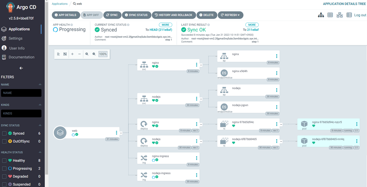 - SYNC POLICY : Manual 과 Automatic 중에 선택하며, Git의 환경과 비교하는 것을 수동으로 할지 자동으로 할지 선택.